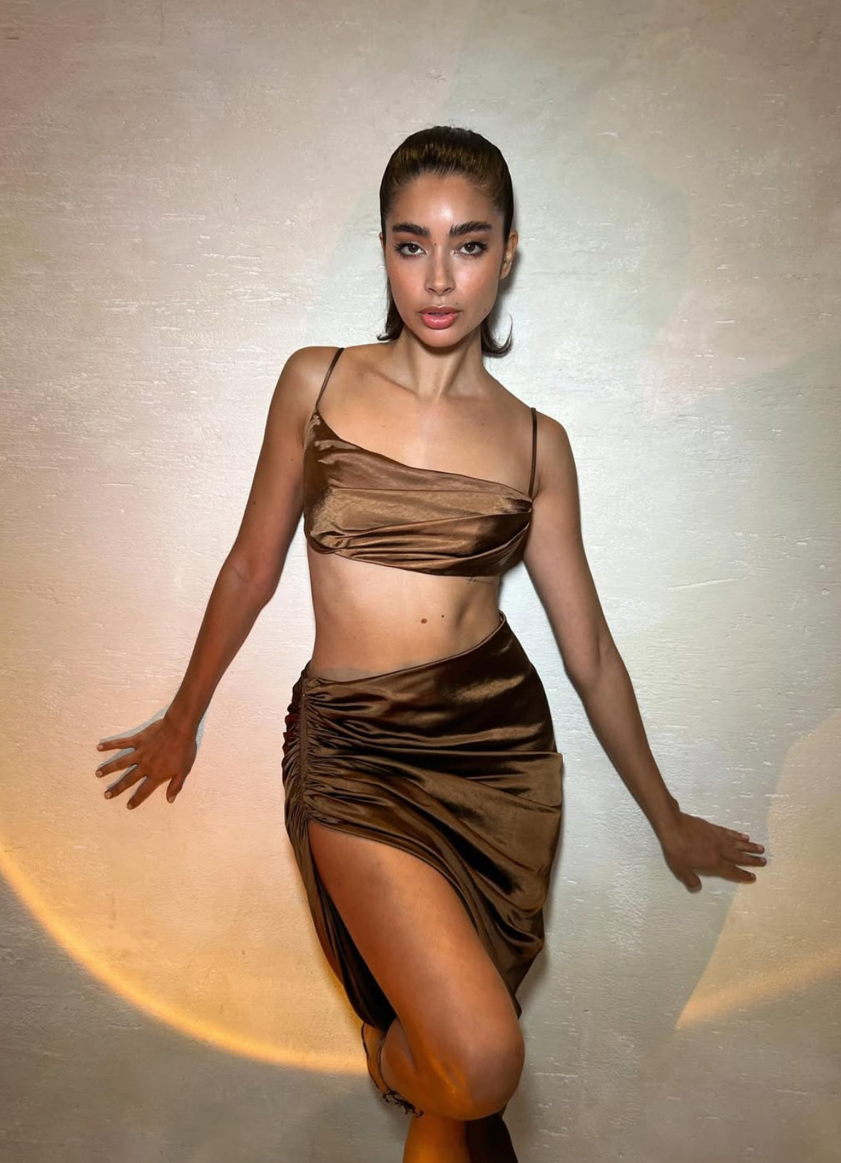 Turn heads in the Azaelia skirt – a sleek, midi-length satin piece designed to elevate your everyday and evening looks. High waisted and a flattering ruched detail along the side and a thigh-high slit for a touch of allure, Azaelia effortlessly hugs your curves while offering elegant movement.