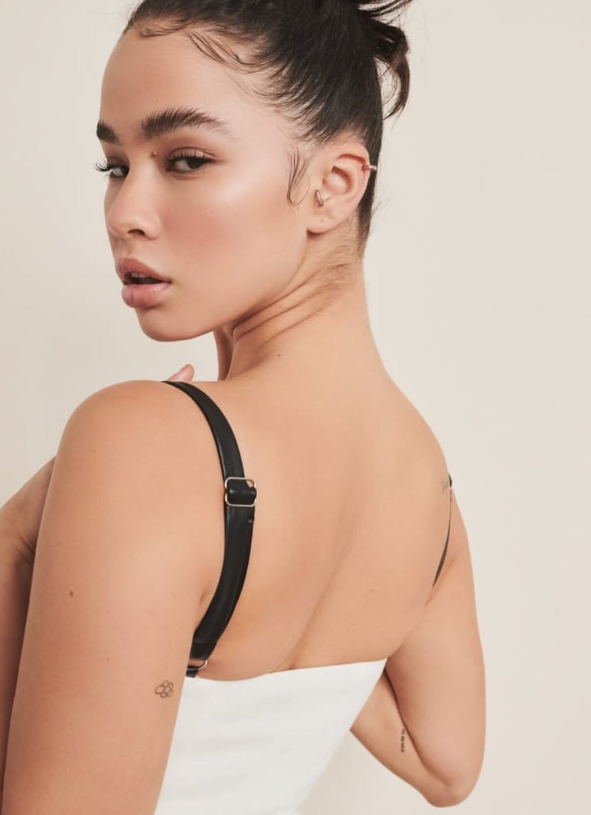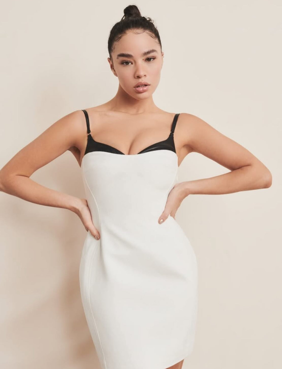 Clean lines, bold edges. This mini dress pairs structured white denim with sleek pleather straps and sharp trim — made to stand out, day or night.