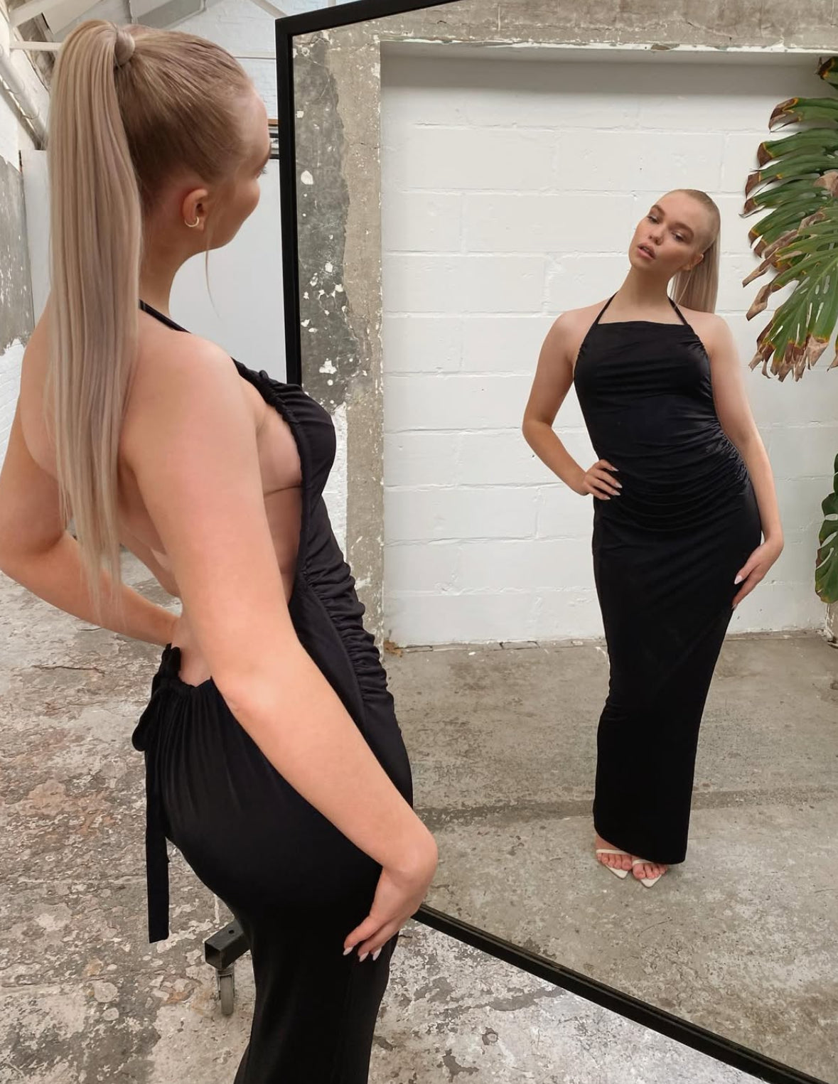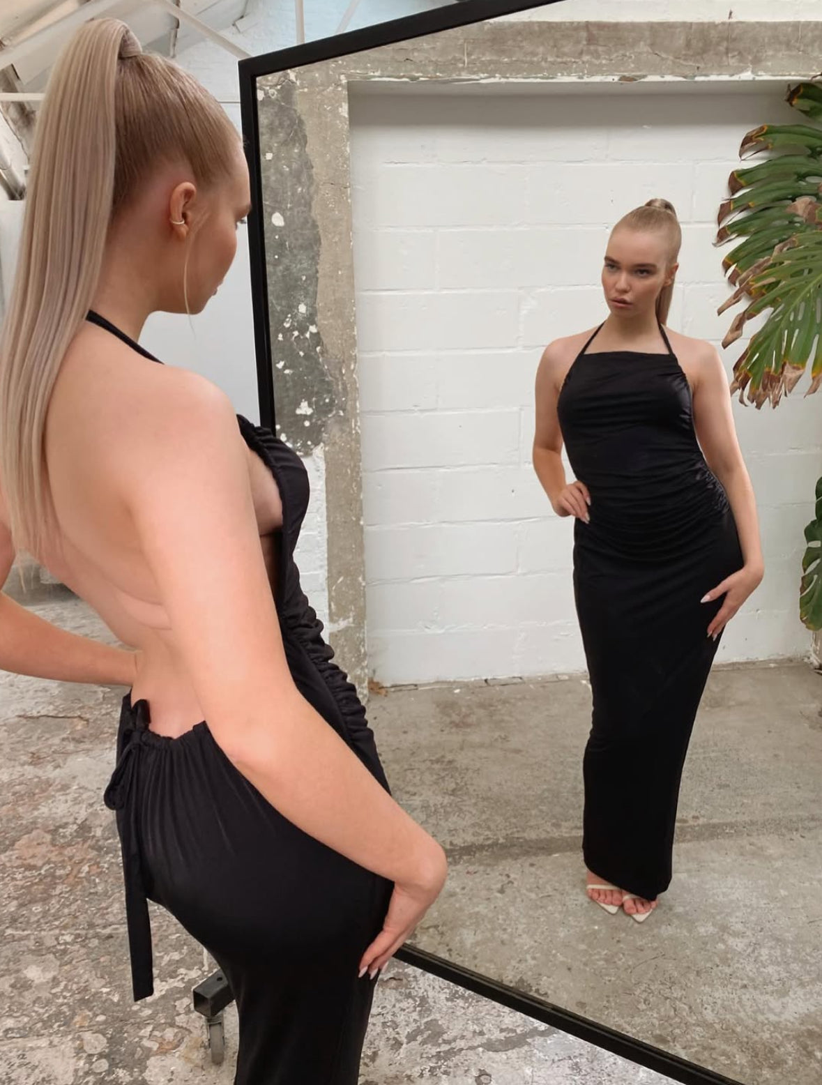 Say hello to Léa — the dress that defines after-dark elegance. With a sultry open back, flattering halter neckline, and gentle ruching that contours your curves, this maxi is all about confidence with minimal effort. The silky stretch fabric hugs in all the right places, making Léa your go-to for elevated evenings or that last-minute dinner date.
