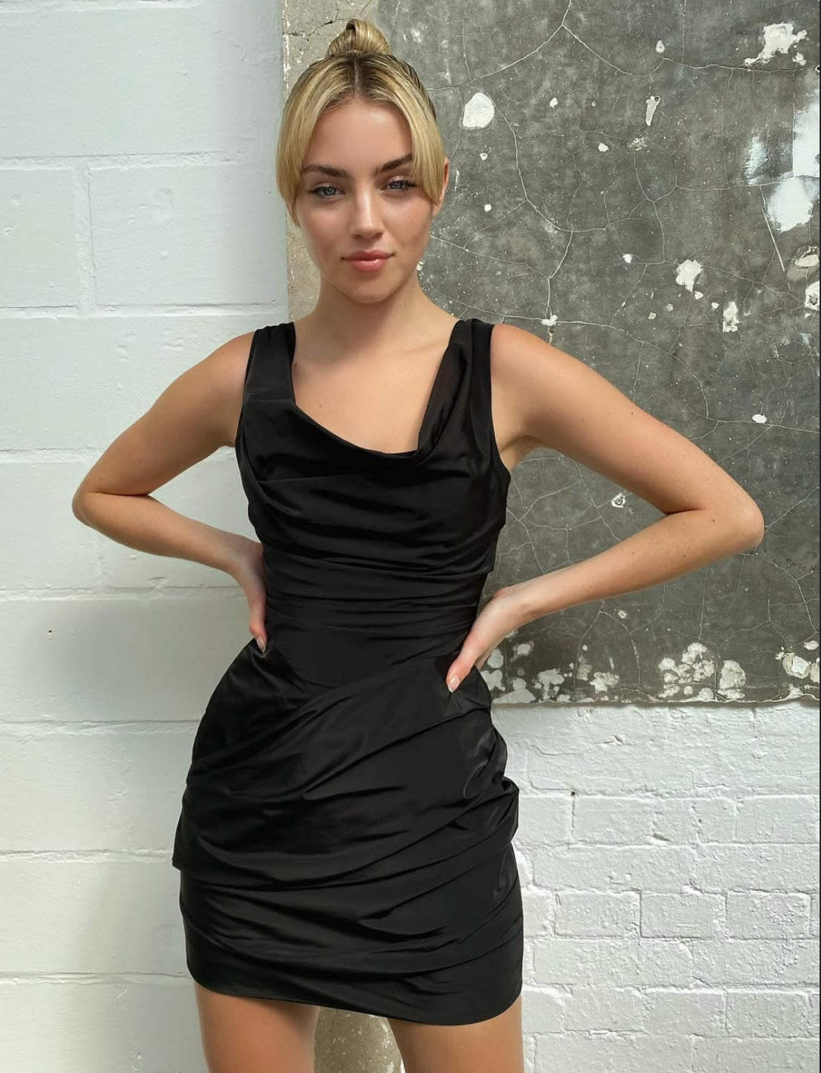 Night out, locked in. The Lexi is your second-skin mini with a soft drape neckline and that perfectly gathered fit. Cut to contour, built to turn heads — she’s your last-minute yes that always delivers. You won’t need to overthink it, just add gloss and go.