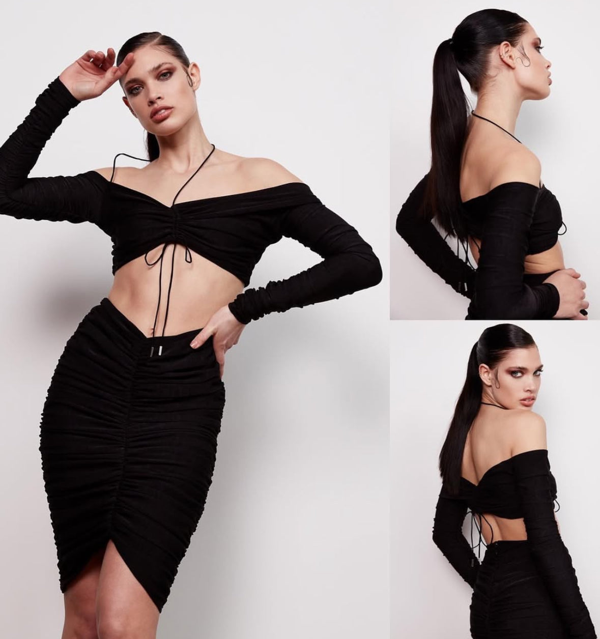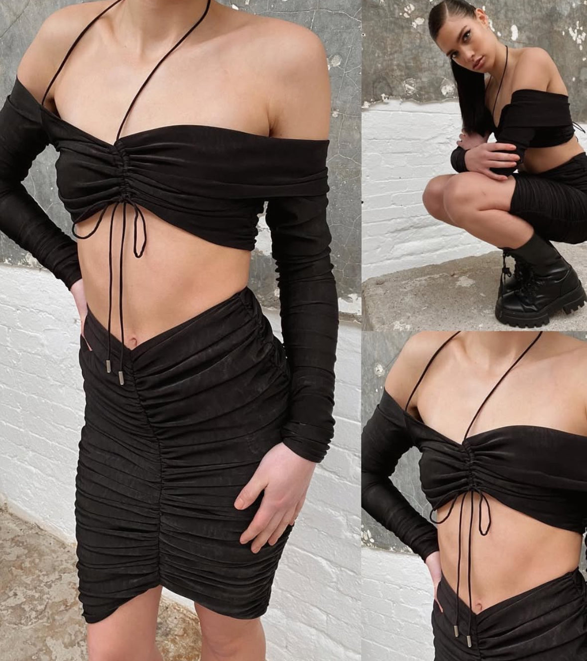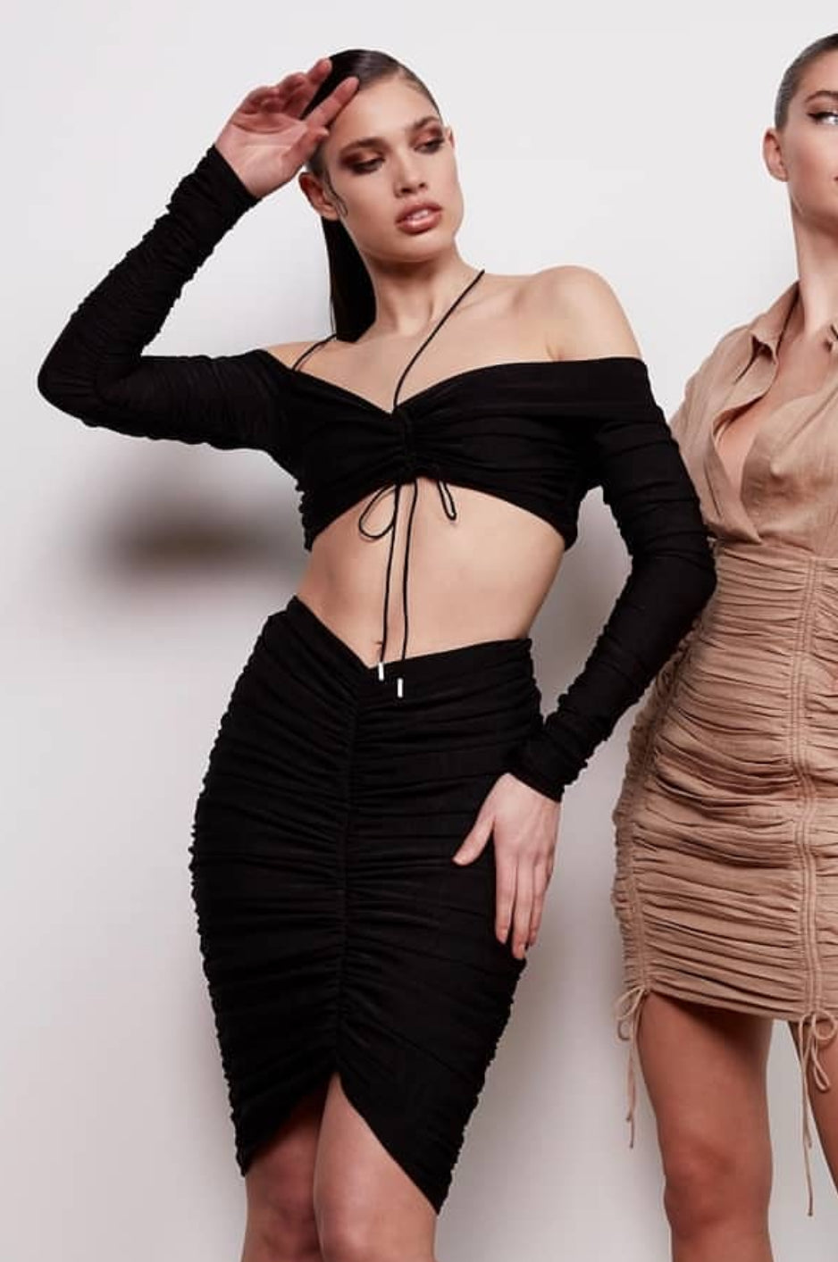 Meet Raye — off-shoulder, ruched, and unapologetic. She’s that barely-there but does the most top. Finished with a halter tie and soft stretch fabric that hugs in all the right places. Pair with the matching skirt or throw her on with cargos — either way, Raye always gives.