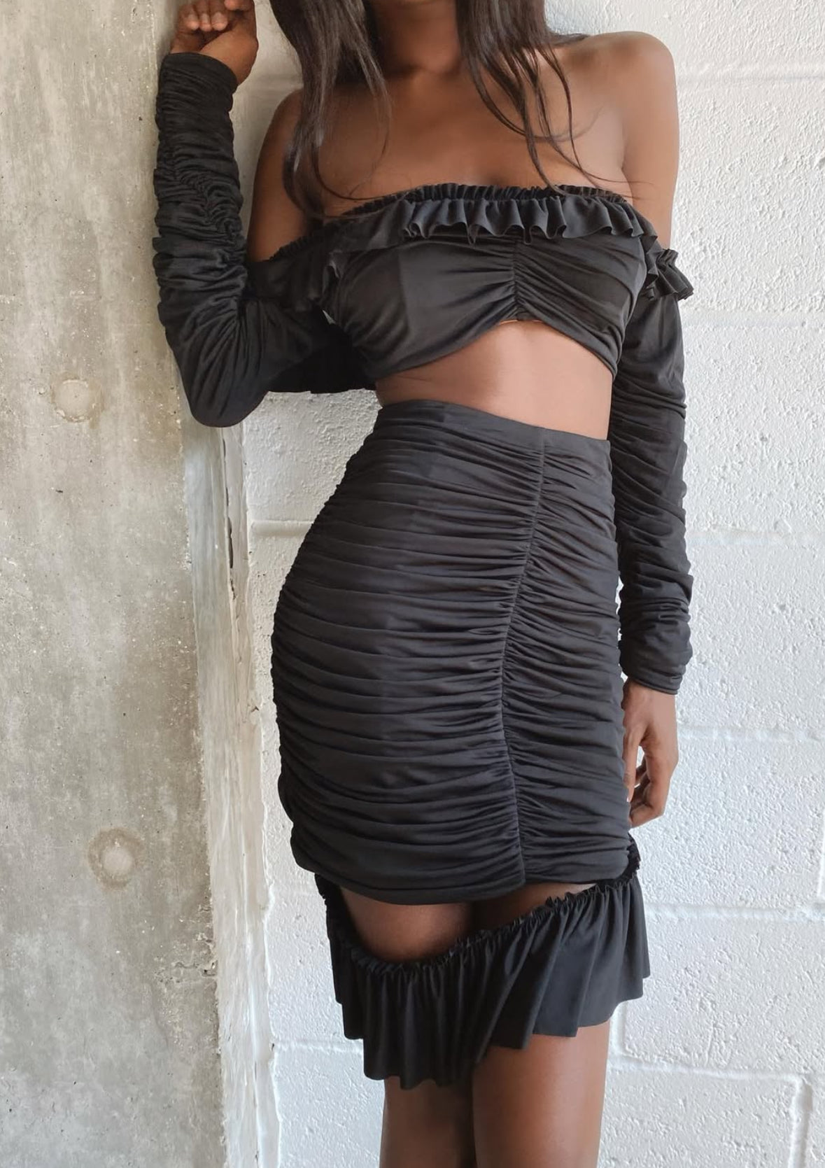 Zuri brings high-impact energy with a sculpted ruched silhouette and an unexpected asymmetric frill. Designed to sit high on the waist and hug in all the right places, this jet black mini is anything but basic. It’s drama — but refined.