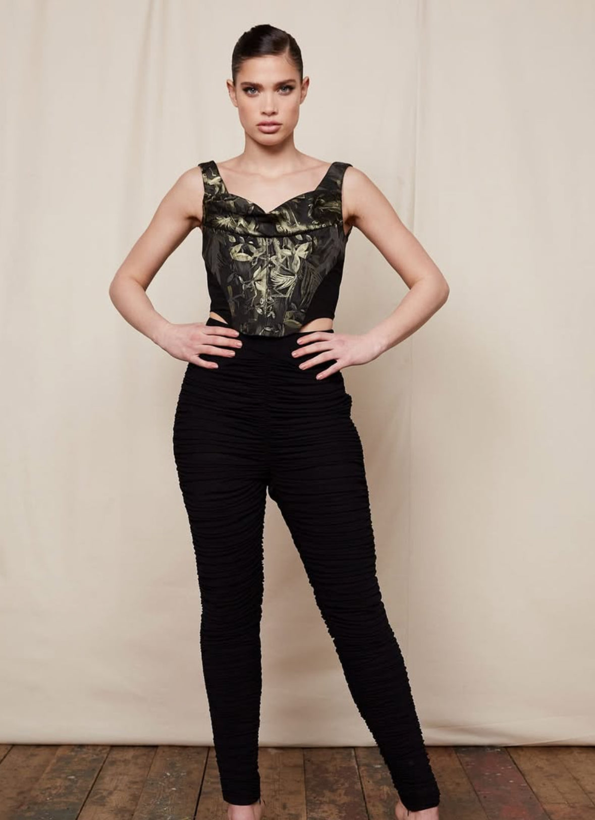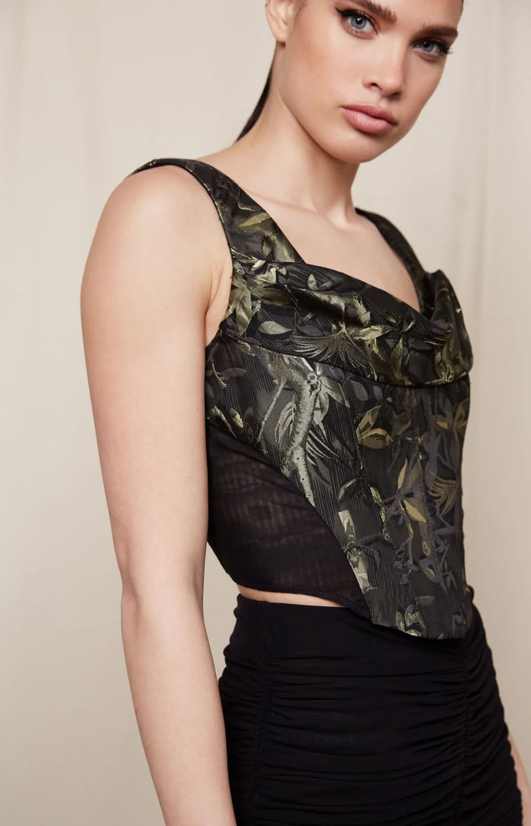 Command attention in the Yasmine Corset — a structured statement piece crafted from luxurious jacquard brocade in rich, earthy tones. Featuring a draped cowl neckline and a flattering, sculpted bodice, this top pairs timeless elegance with modern edge. The intricate leaf pattern adds texture and depth, while the corset silhouette cinches at the waist for a dramatic hourglass effect. Style it with tailored trousers or a sleek satin skirt for a powerful evening look.